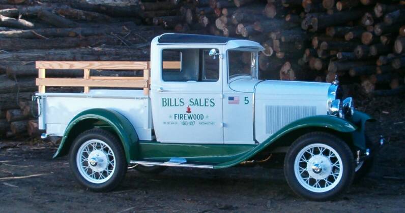 The two pictures above of our shop show the growth that has occurred over the years. The square footage is the same, but we have had to use all of the space available to us to allow for our expanded line of outdoor products and our pile of firewood. If you look real close at the picture from 1980 you can actually see Bill outside on the loading dock as the picture was taken. He is just below the 8 in 1980 surrounded by some of his picnic tables. The day the picture was taken in 2003 Bob was out back working, but we weren't able to get his picture. In what little spare time he has Bob works in his garage restoring Model A cars and trucks. The picture below is the first truck that he restored named Billee.